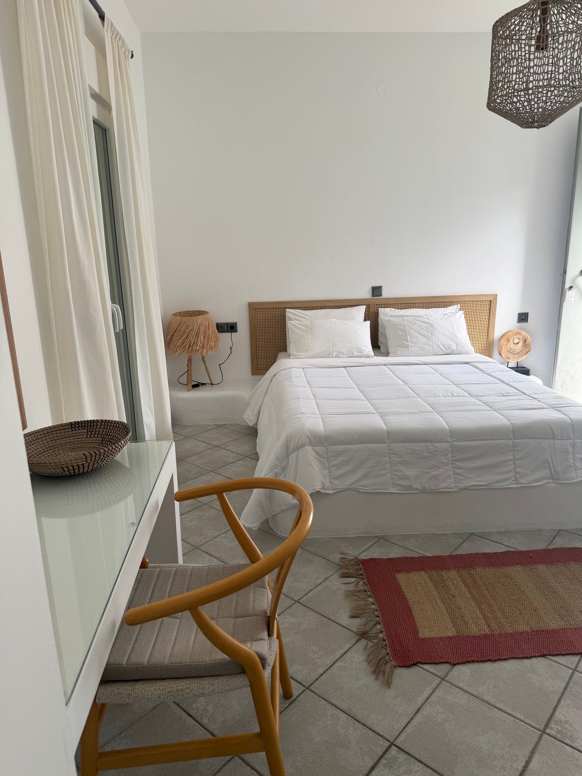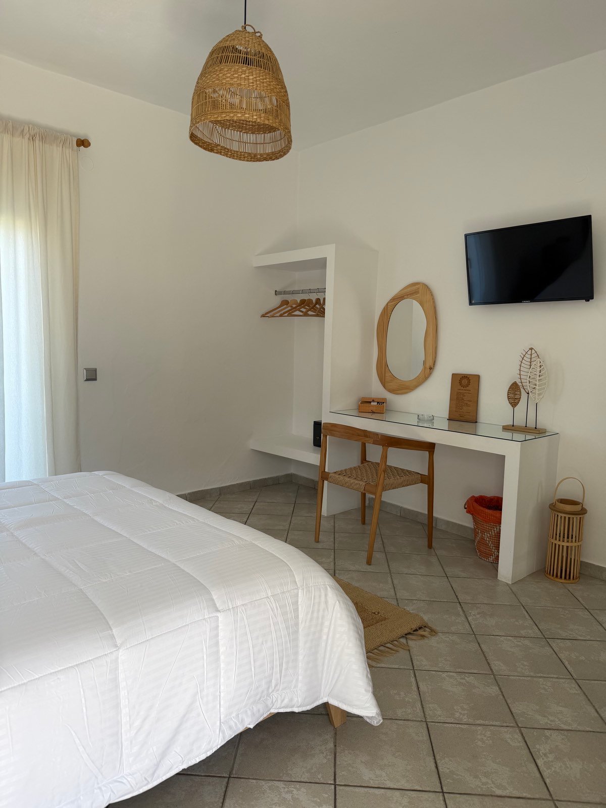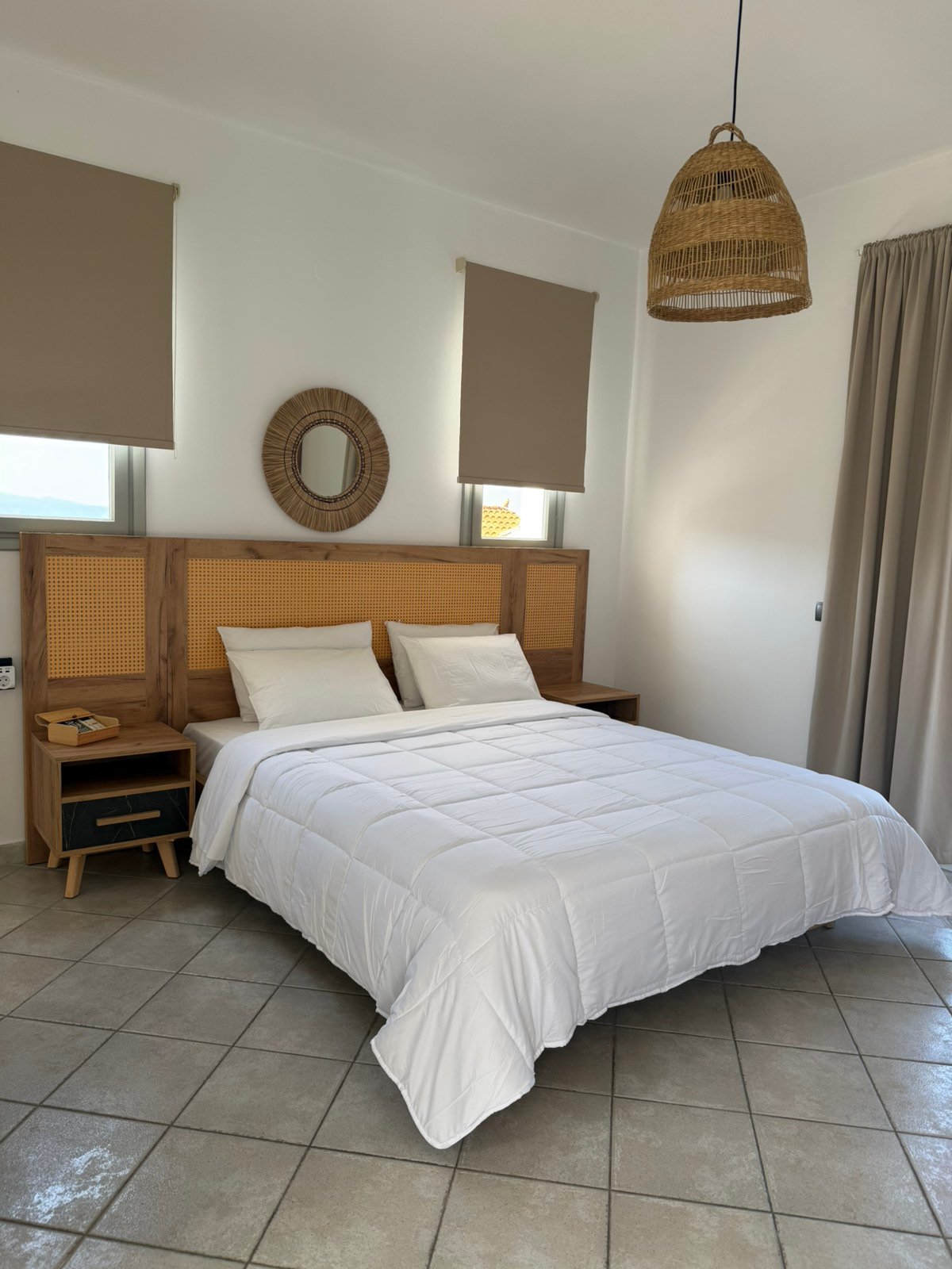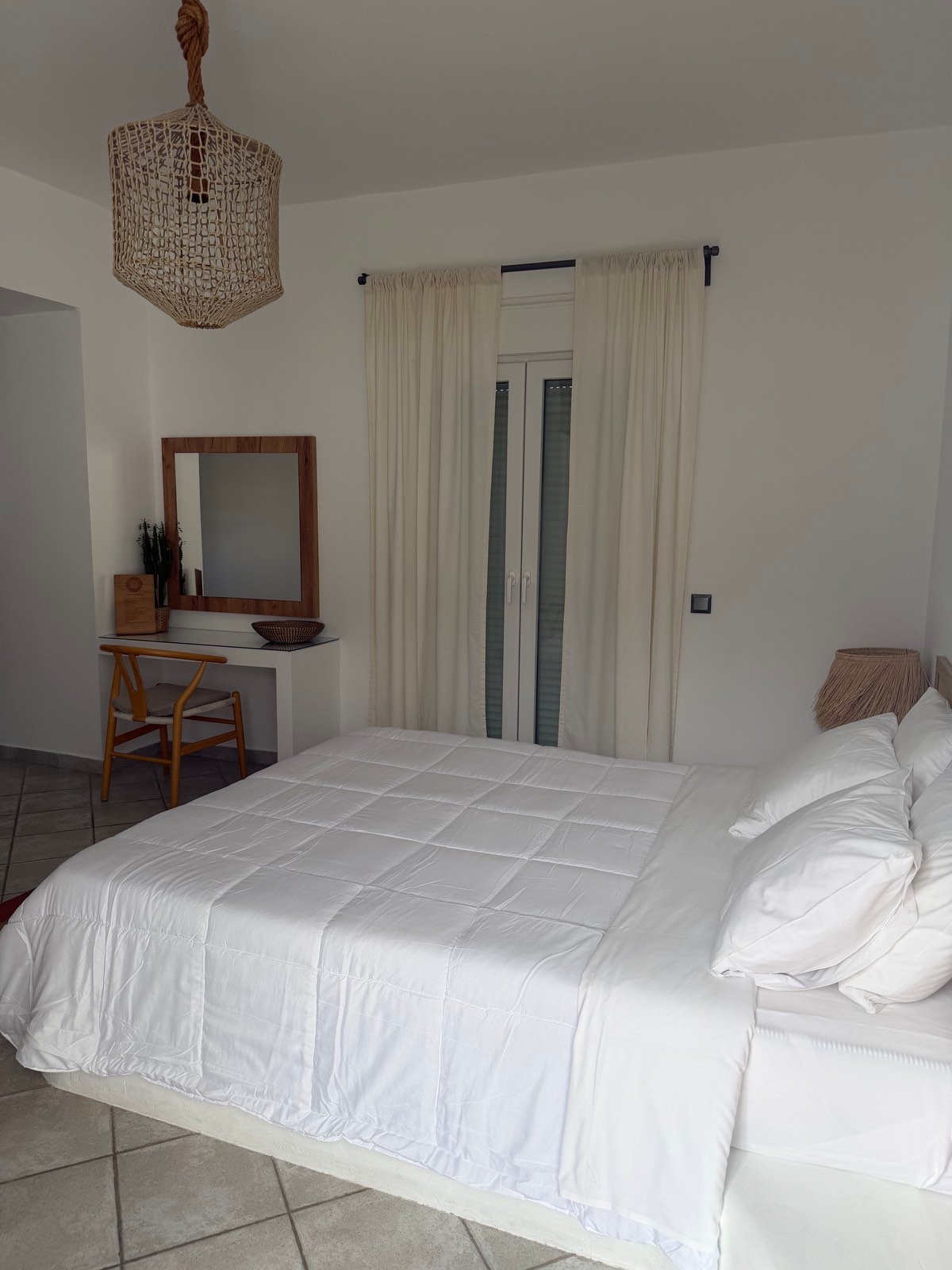 Το Δίκλινο Δωμάτιο του Villa of the God αποτελεί την ιδανική επιλογή για ζευγάρια ή επισκέπτες που αναζητούν άνεση και χαλάρωση σε ένα καλαίσθητο, νησιώτικο περιβάλλον. Με λιτή, «boho» αισθητική και προσεγμένη διακόσμηση, ο χώρος αποπνέει ηρεμία και ισορροπία, προσφέροντας μια ευχάριστη εμπειρία διαμονής.